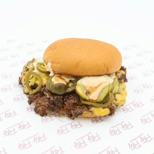 mit double Beef, Gurken, 3x Käse, Jalapenos und hausgemachter Chili-Sauce